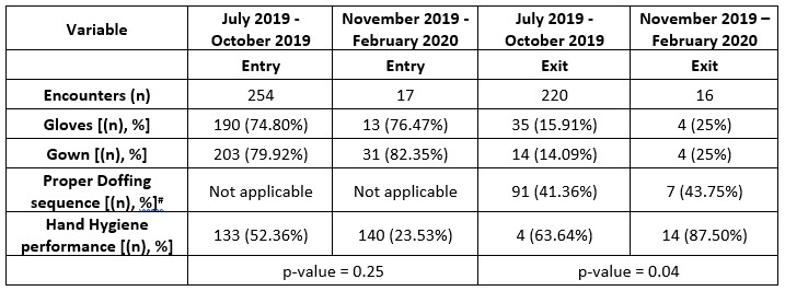 Table 2: Comparison of PPE compliance rates (use of gowns, gloves, and mask), proper doffing sequence and hand hygiene at entry and exit at a Cdiff patient’s room, between two time periods [#: Doffing was recorded by RVA only at time of exit from Cdiff rooms]