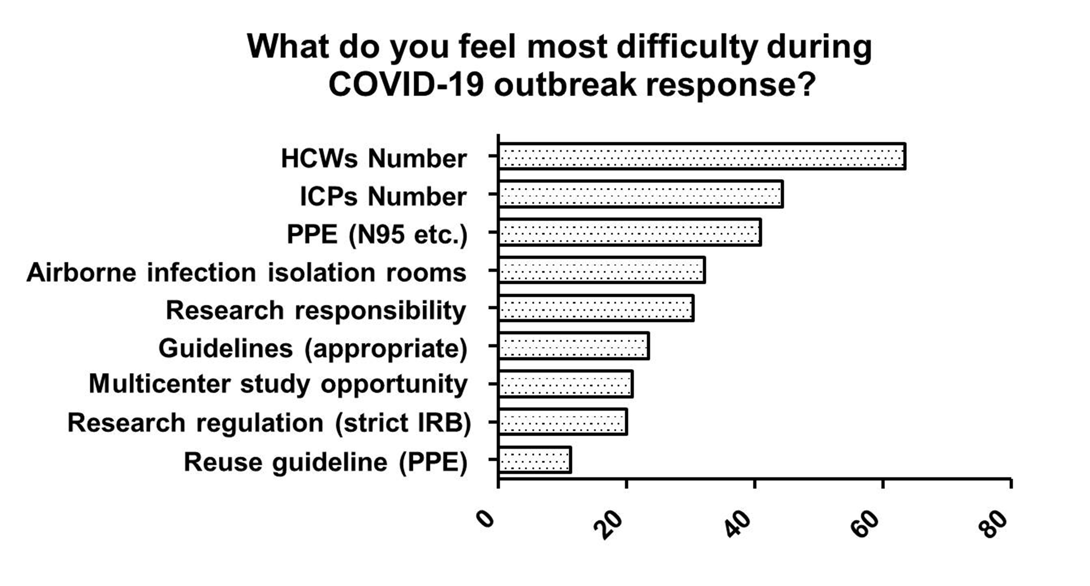 Figure 1. Difficulties in response to the COVID-19 outbreak. Abbreviations: COVID-19, coronavirus disease 19; HCWs, healthcare workers; ICPs, infection control practitioners; IRB, Institutional Review Board; PPE, personal protective equipment