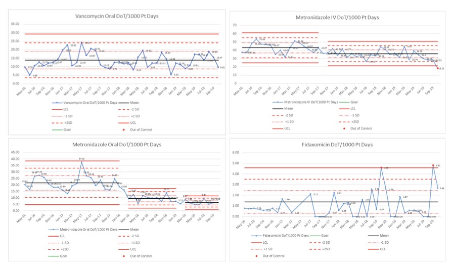 During the first phase, and a full year of the protocol in 2018, the number of completed PCR tests decreased to 626 (compared to 940 PCR tests in 2016) with an 34% decrease. In the year following implementation of the Diagnostic Stewardship, HO CDI decreased from 60 in 2017 to 43 events in 2018 with a reduction of 28%. Subsequently, HO CDI further decreased in 2019 to 28 with a reduction of 35%. Since the start of the project in 2017, HO CDI have decreased 54% in total. The reduction in 314 C diff PCR tests in the first year[2017-2018] led to a savings of $8300 in lab supplies. No readmissions with C difficile infection documented within 30 days on patients who did not meet the criterion for testing. Significant decrease in the usage of C difficile antibiotics. After the start of the two step test, we have seen a precipitous drop in our HO-CDI rates to less than 0.3 per 1000 pt days by the end of 2019. Quarterly comparison of HO CDI incidence for 2017-2020