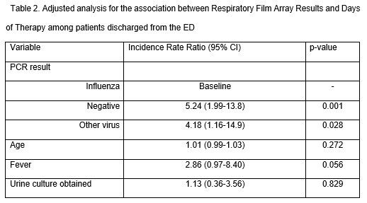 Adjusted analysis for the association between Respiratory Film Array Results and Days of Therapy among patients discharged from the ED