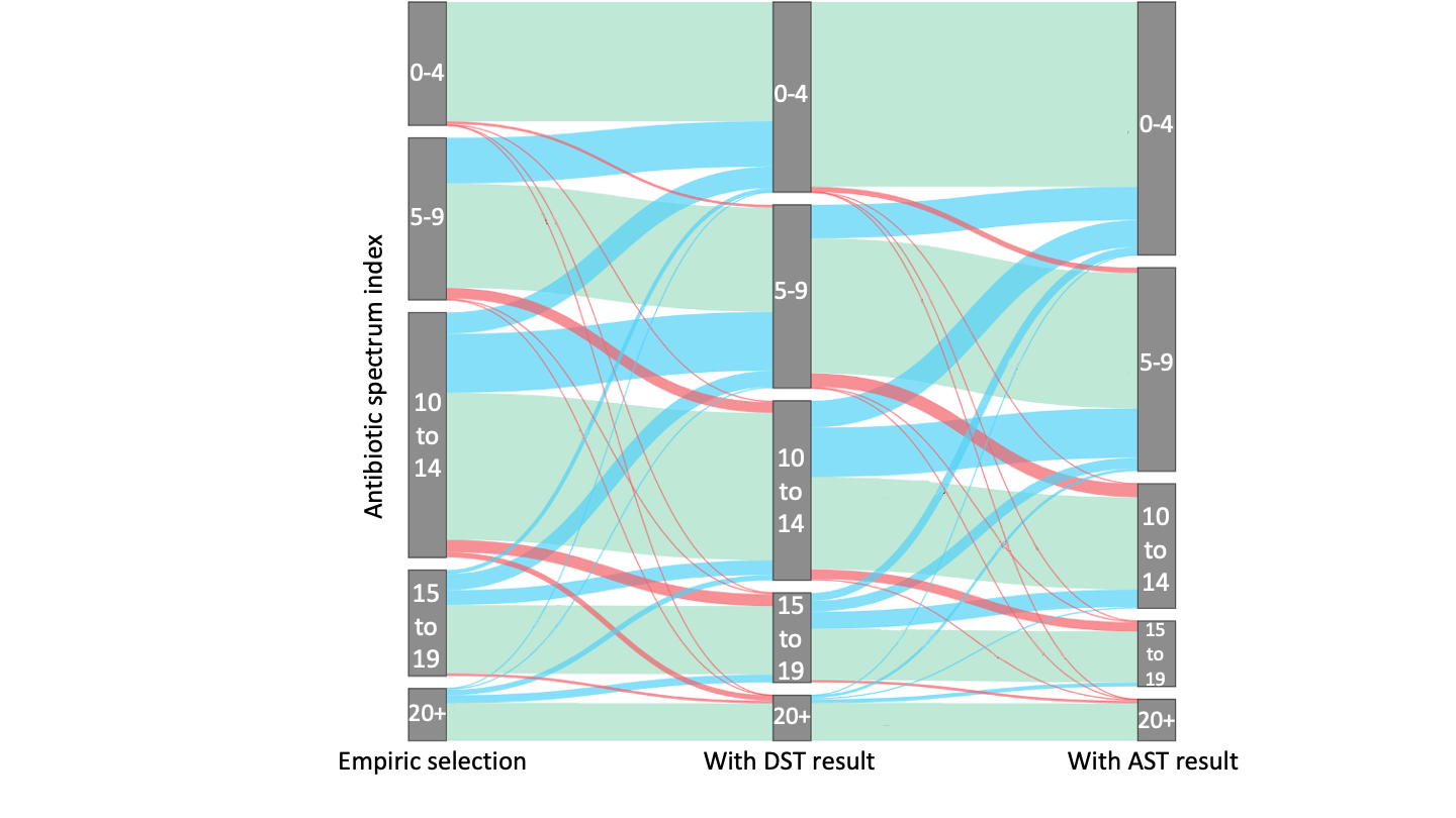 Figure: Distribution of spectrum of antibiotics ordered to treat bacteremia in pediatric patients. Antibiotic spectrum, as measured by the antibiotic spectrum index, is represented in this Sankey diagram on the Y-axis. The height of each group indicates the proportion of patients with an aggregate antibiotic spectrum falling in that category at three time points. The ASI of empiric antibiotics was measured just before the DST result to provide time for a treating physician to settle on an empiric regimen. The ASI with the DST result was measured just before the ASI result. The ASI with the AST result was measured 24 hours after the AST result was available. Green bars indicate the proportion of patients within a group whose ASI remained unchanged between time points. Blue bars indicate the proportion of patients within a group whose ASI decreased, and red bars indicate the proportion of patients whose ASI increased between time points.