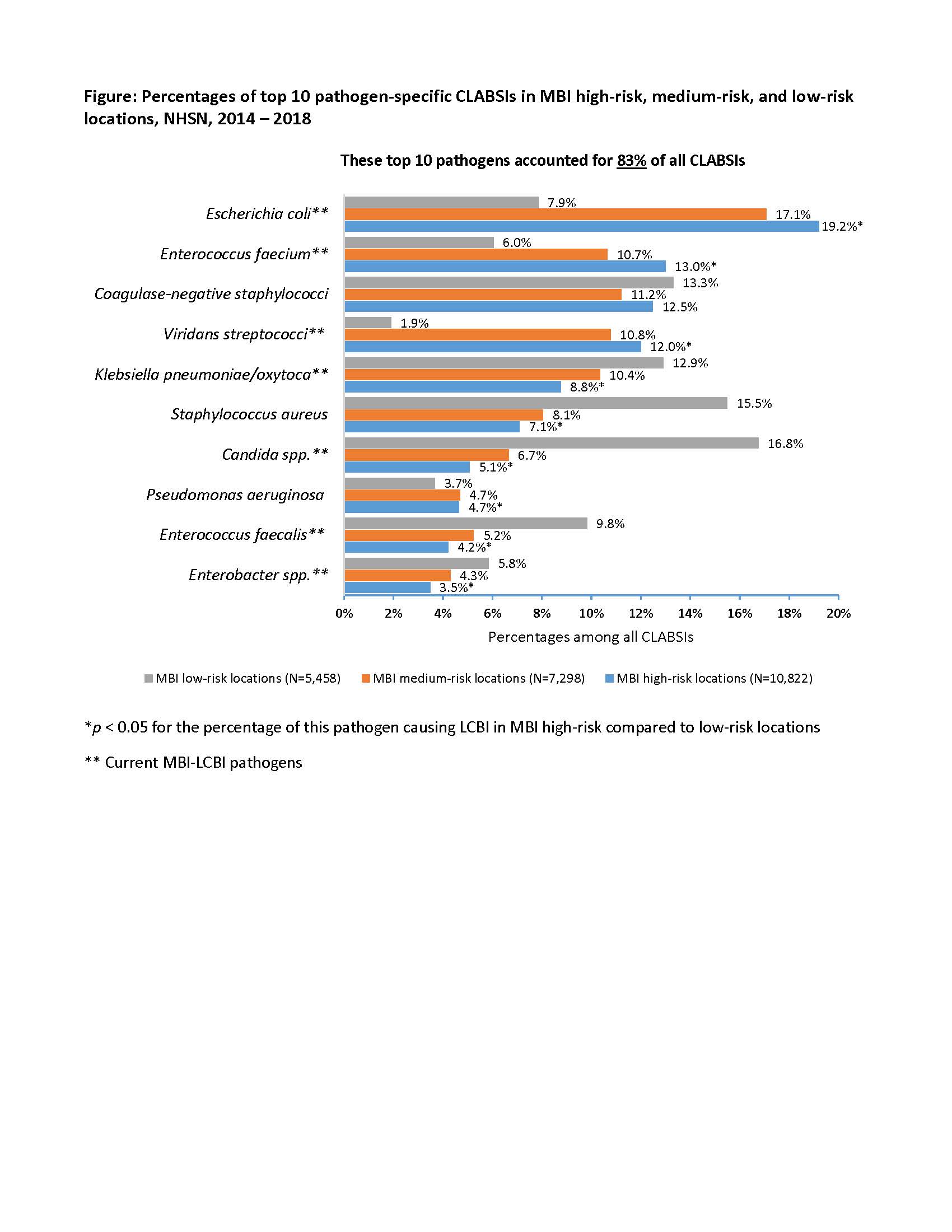Figure: Percentages of top 10 pathogen-specific CLABSIs in MBI high-risk, medium-risk, and low-risk locations, NHSN, 2014–2018