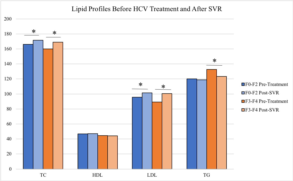 Figure 1. Mean lipid profile parameters before and after HCV treatment for patients who achieved SVR. TC was measured a mean of 8.1 months (228 days, SD 333 days) before treatment and 17.4 months (488 days, SD 196 days) after SVR. LDL was measured a mean of 8 months (224 days, SD 284 days) before treatment and 17.5 months (492 days, SD 201 days) after SVR. *=differences in means using paired t-test were statistically significant with p<0.05. HCV= Hepatitis C Virus, SVR= Sustained Virologic Response TC=Total Cholesterol, HDL= High Density Lipoprotein, LDL= Lipoprotein, TG= Triglycerides.