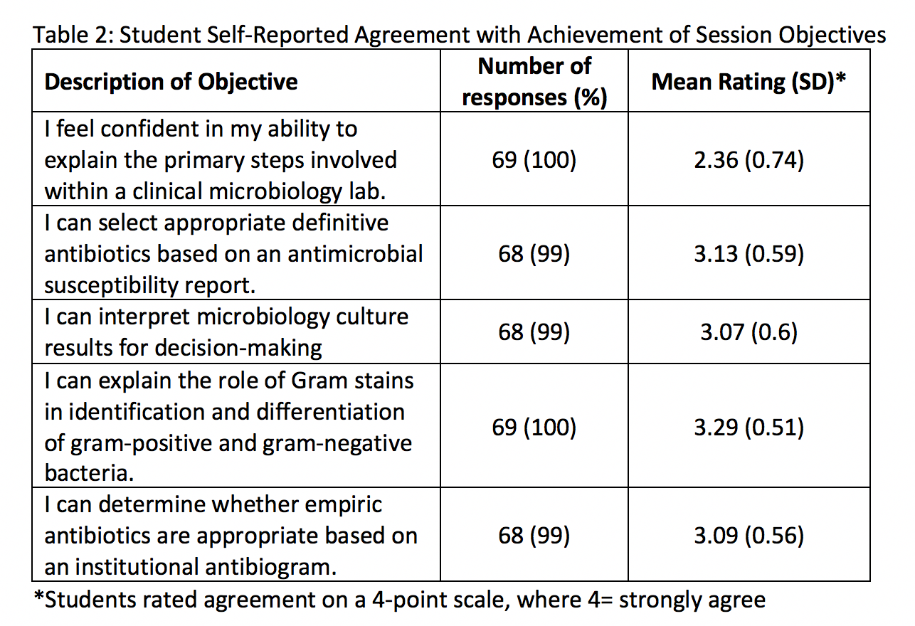 Table 2: Student Self-Reported Agreement with Achievement of Session Objectives