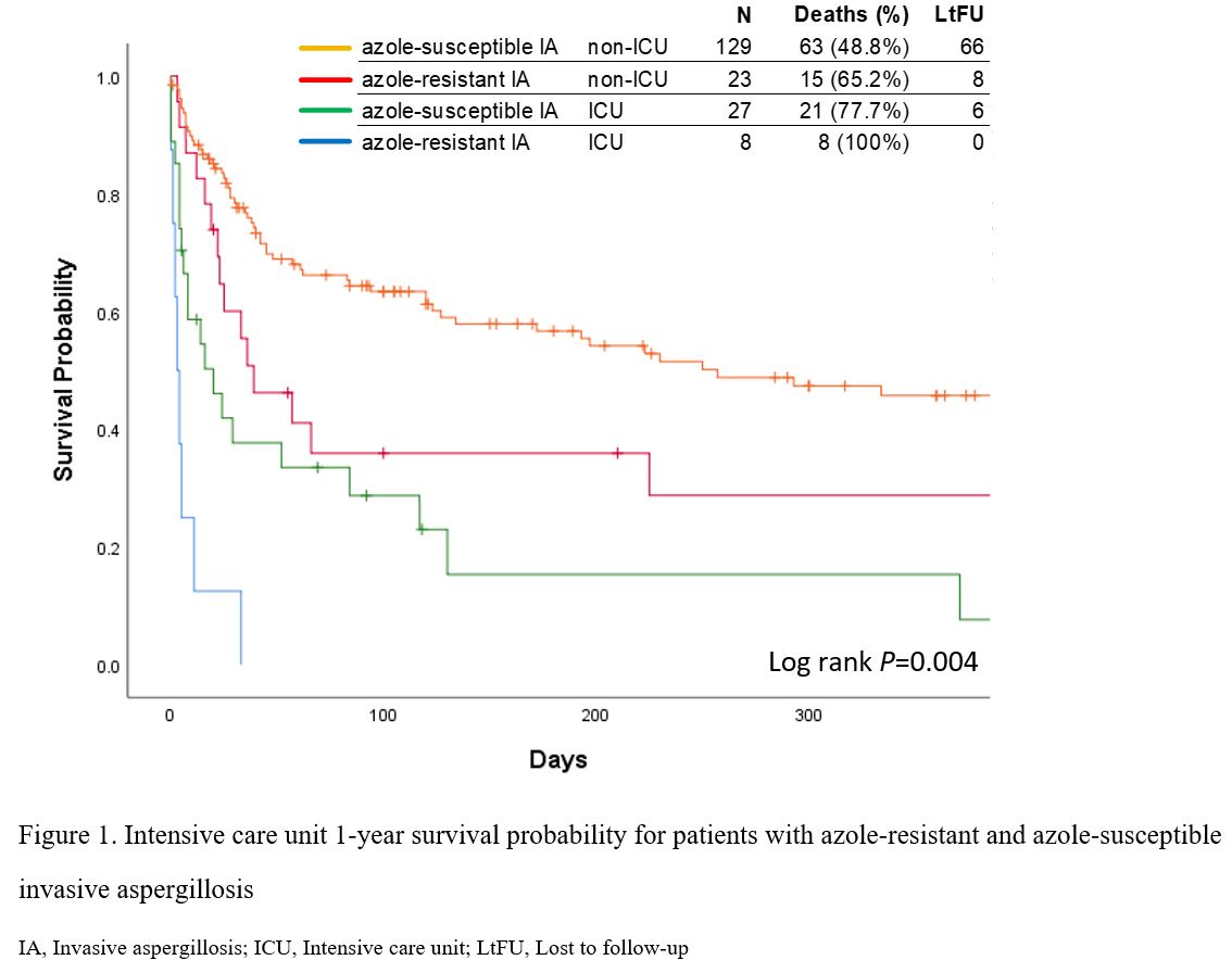 Figure 1. Intensive care unit 1-year survival probability for patients with azole-resistant and azole-susceptible invasive aspergillosis