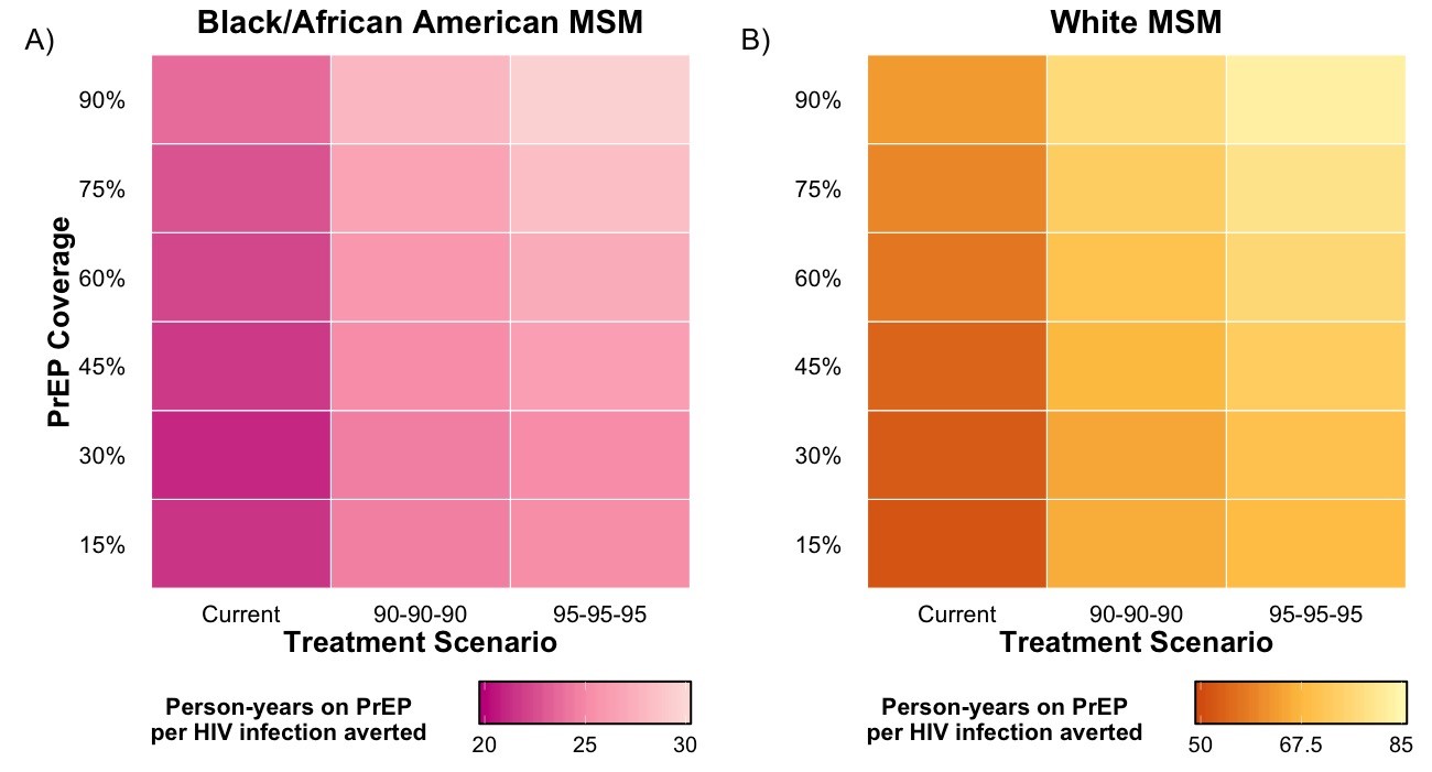 Person-years of pre-exposure prophylaxis use per HIV infection averted among Black/African American (Panel A) and White (Panel B) men who have sex with men in Atlanta across scenarios of varied levels of treatment engagement among agents living with HIV infection and levels of pre-exposure prophylaxis use among HIV-uninfected agents. Note: The number of HIV infections averted is calculated within each set of treatment scenarios relative to a scenario where no agents use pre-exposure prophylaxis.