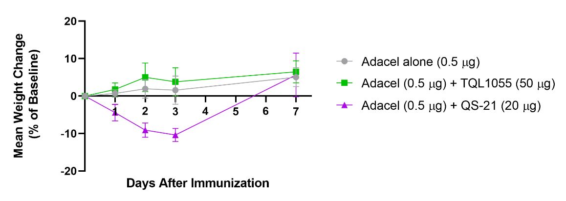 Figure 2: TQL1055 Shows Enhanced Tolerability (measured by decreased weight loss) Compared to QS-21 Following Subcutaneous Injection in C57BL/6J Female Mice