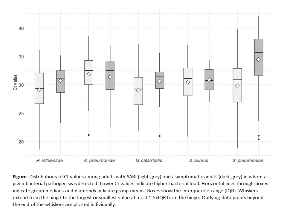 Distributions of Ct values among adults with SARI and asymptomatic adults in whom a given bacterial pathogen was detected