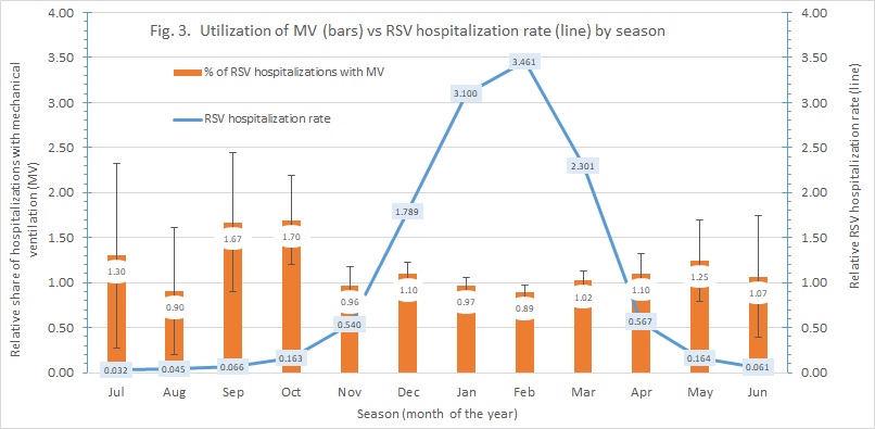 Fig. 3. Utilization of MV (bars) vs RSV hospitalization rate (line) by season