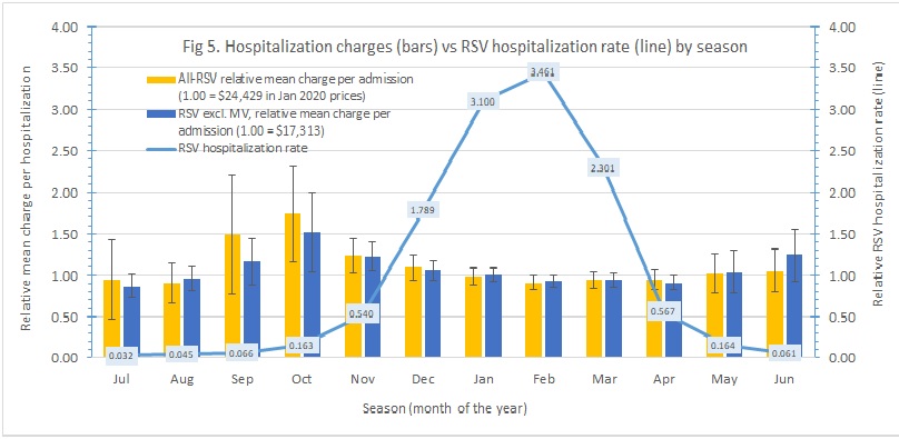 Fig. 5. Hospitalization charges (bars) vs RSV hospitalization rate (line) by season