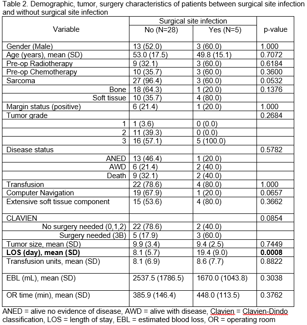 Table 2. Demographic, tumor, surgery characteristics of patients between surgical site infection and without surgical site infection
