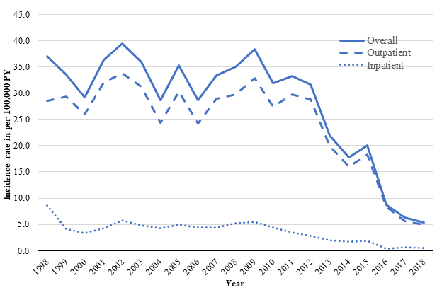 Figure 2. Non-invasive pneumococcal pneumonia incidence in children 2 - 4 years, episodes per 100,000 patient-years (1998 - 2018)