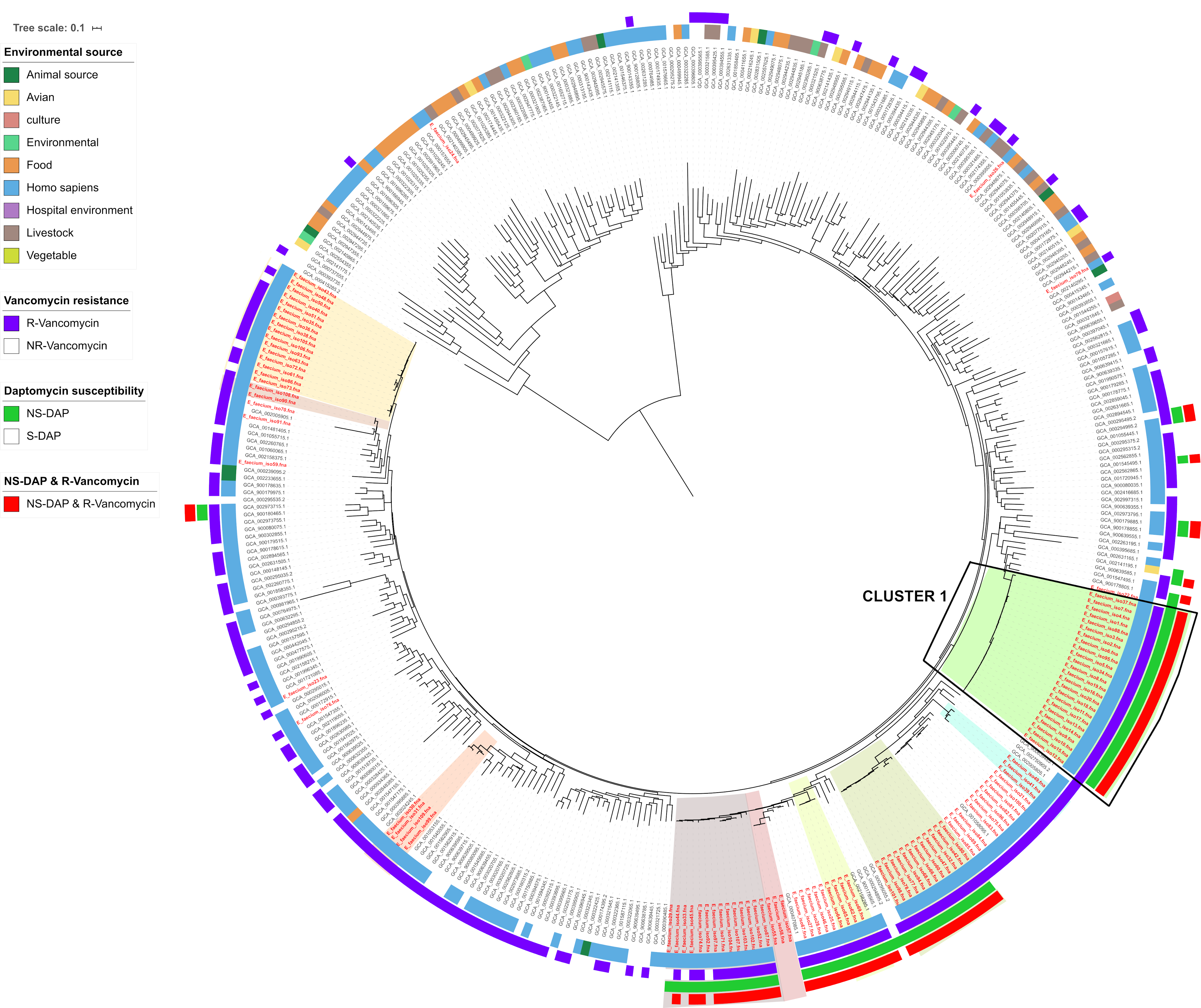 Image 4 - Dendrogram of 106 isolates performed with coreSNP(Single Nucleotide Polymorphisms) pairwise distances. • Dendogram shows different patients (same color for isolates that belong to the same patient) and the patient numbers. • Besides the patient number, the number of largest number SNPS that separate those isolates is shown. • Branches represent the number of coreSNPs that differ strains from that branch. As you see isolates from cluster 1 differ in a maximum of 5 SNPs but isolates of patient 1 and patient 2 differ in 0 SNPs between them. Cluster 1 is represented by a green square.