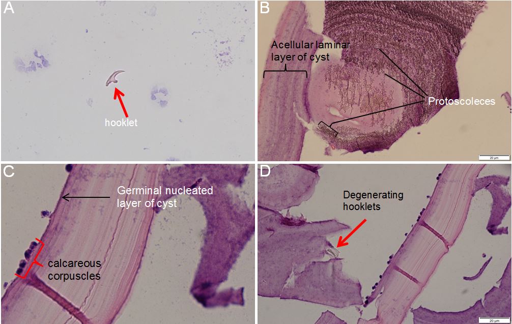 Fig. 6: Case 1 - Histopathologic slides (H&E stain) demonstrating hooks and scolices consistent with Echinococcus multilocularis. A. Hooklet (100x magnification). B. Hydatid cyst with black-staining structures suggestive of degenerating hooklets. C. Zoomed detail of cyst wall. D. Degenerating hydatid cyst and hooklets..jpg)