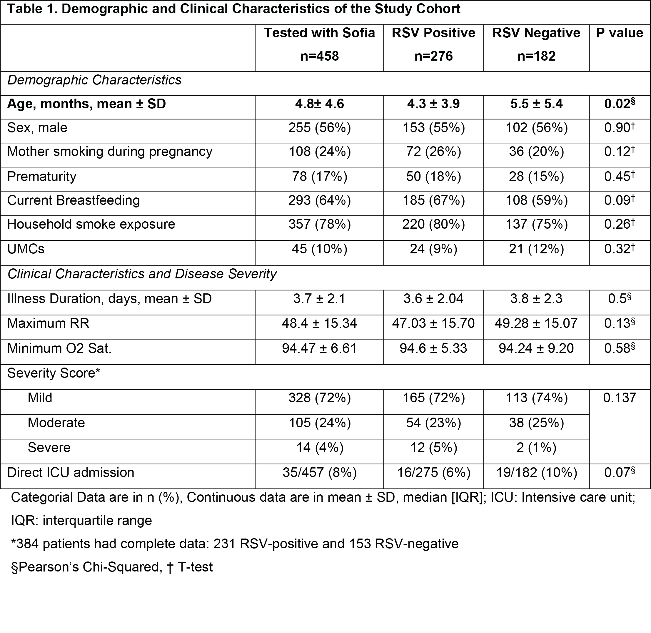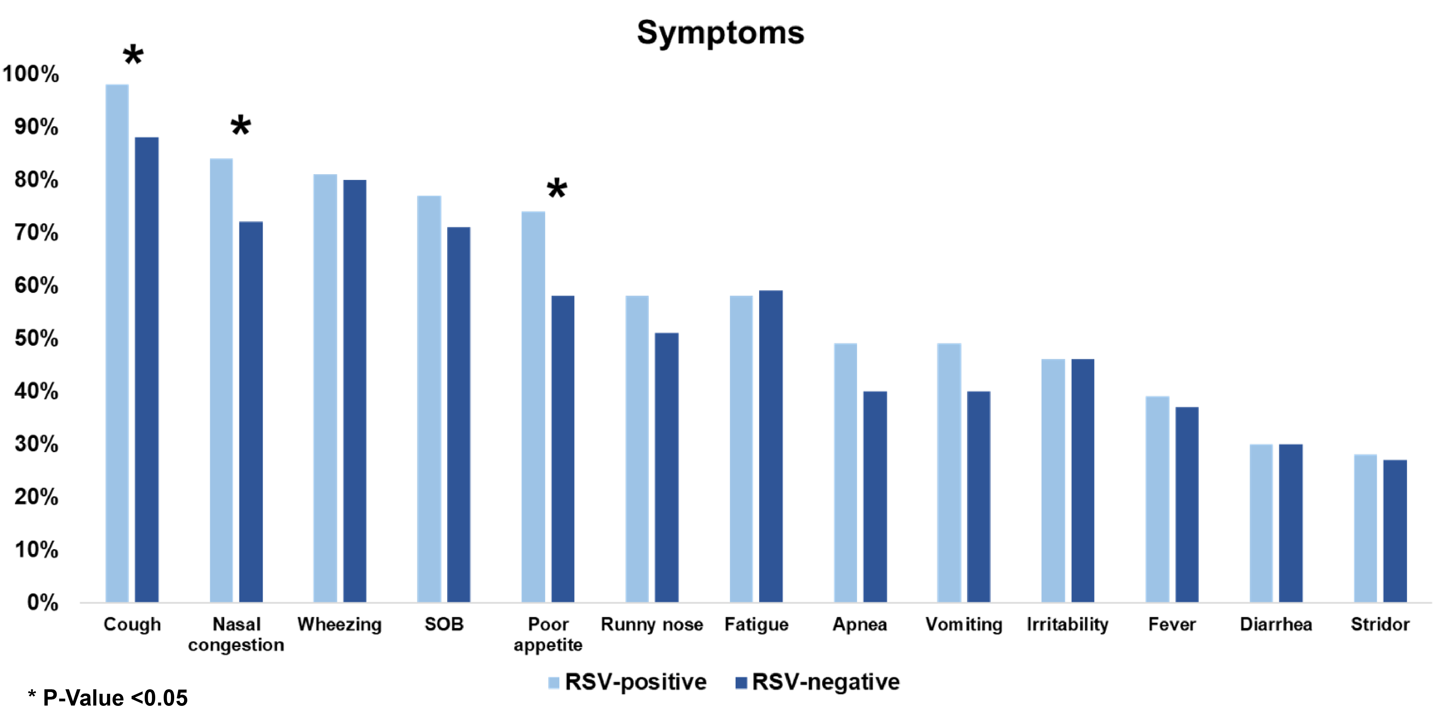 Children less than two years hospitalized with fever and/or respiratory symptoms were recruited at Al-Bashir Government Hospital from January 8, 2020, to March 17, 2020. Nasal swabs were collected and tested by Sofia-2 RSV Fluorescent Immunoassay. Demographic information and clinical history were obtained through parental interviews. A validated severity score was used to assess disease severity, and the treating physician prospectively collected the necessary information to calculate the score at admission. Disease severity was categorized based on the total score into 0-5 mild, 6-9 moderate, and ≥ 10 severe. Molecular testing and medical chart reviews are still in process.
