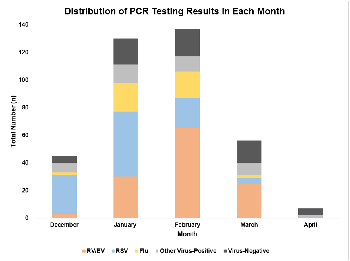 From 12/16/2019 to 4/30/2020, 364 infants were enrolled, and 361 (99%) had nasal swabs collected and tested. Of those, 295 (82%) had at least one virus detected; rhinovirus/enterovirus (RV/EV) [124 (42%)], respiratory syncytial virus (RSV) [101 (32%)], and influenza (flu) [44 (15%)] were the three most common pathogens detected. No samples tested positive for SARS-CoV-2. Overall, the mean age was 6.1 months, 50% were male, 45% White and 27% Hispanic. Figure 1 shows the total number of PCR viral testing results by month. RSV was the most frequent virus detected in the IP (63%) and ED (37%) settings, while RV/EV was the most common in the OP setting (Figure 2). Figure 3 displays viral seasonality by clinical setting, showing an abrupt decrease in virus-positive cases following the implementation of a stay-at-home order on March 23, 2020 in Nashville, TN. Distribution of PCR Testing Results in Each Month