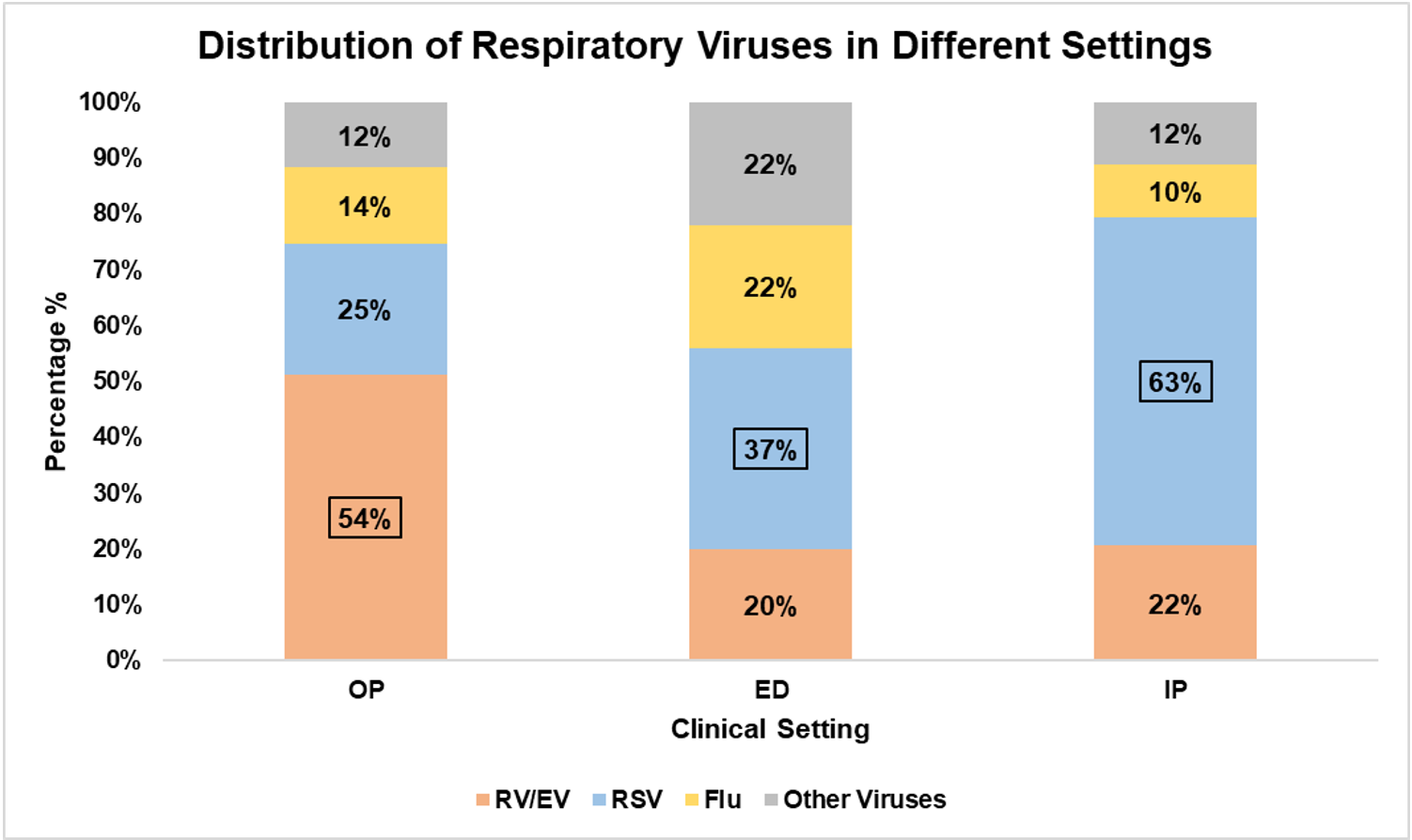 Most medical encounters in infants are due to viral pathogens, with RSV, RV/EV, and flu being the most common. However, distributions differed by clinical setting, with RSV being the most frequently detected in the IP and ED settings, and second to RV/EV in the OP setting. Continued active viral ARI surveillance in various clinical settings is warranted. Preventative measures such as vaccines and infection control measures deserve study to reduce viral ARI burden.