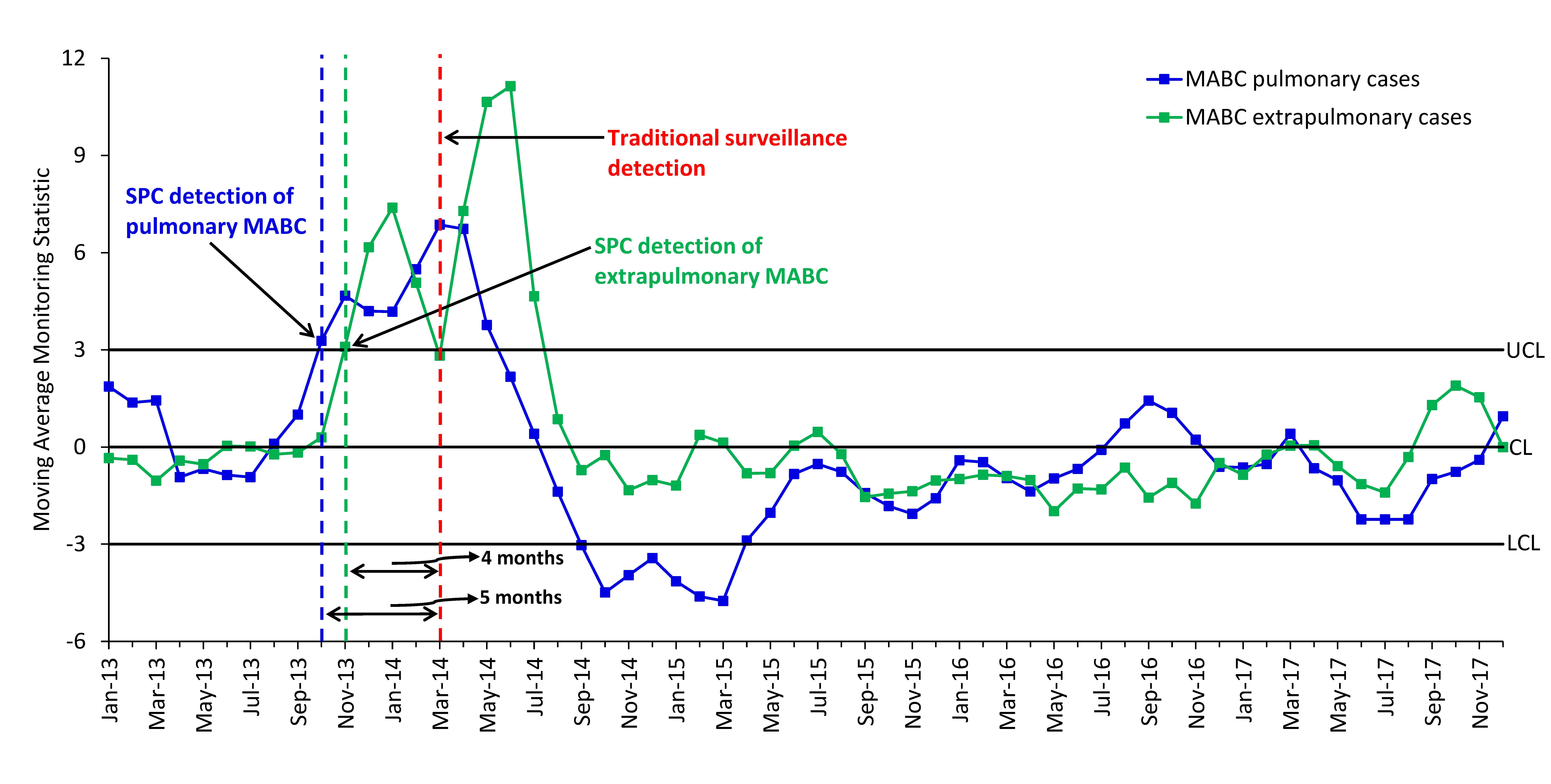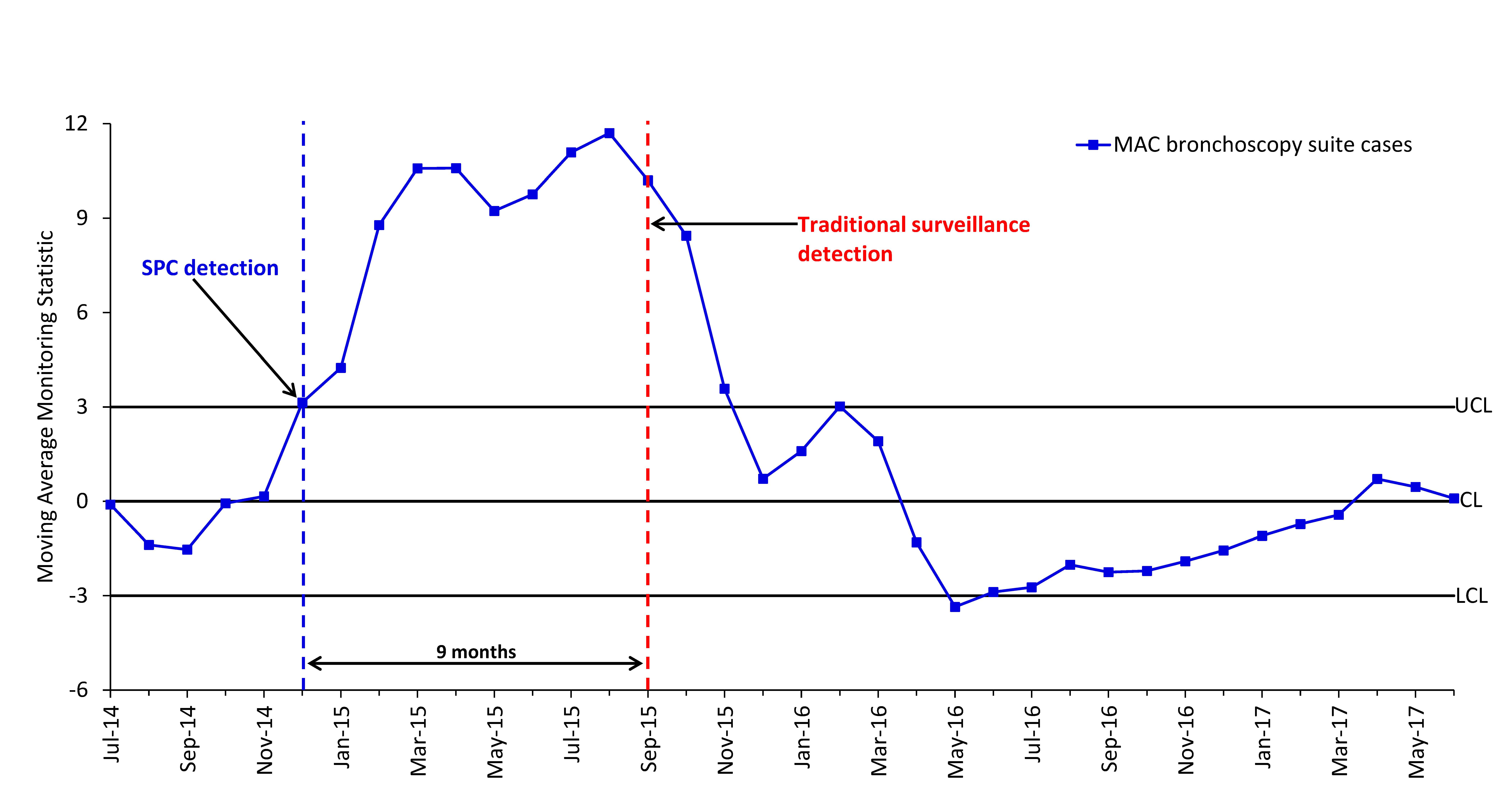 Figure 2. Use of a moving average statistical process control (SPC) chart for early detection of a pseudo-outbreak of Mycobacterium avium complex (MAC) that occurred at a bronchoscopy suite. The chart analyzes cases of MAC isolated from bronchoalveolar lavage cultures. CL, center line; LCL, lower control limit; UCL, upper control limit.
