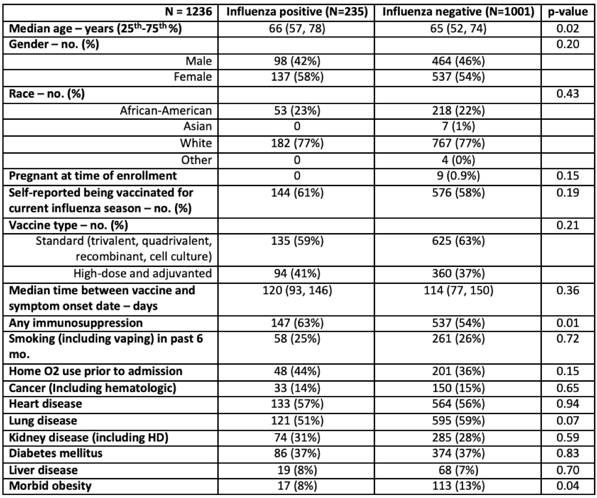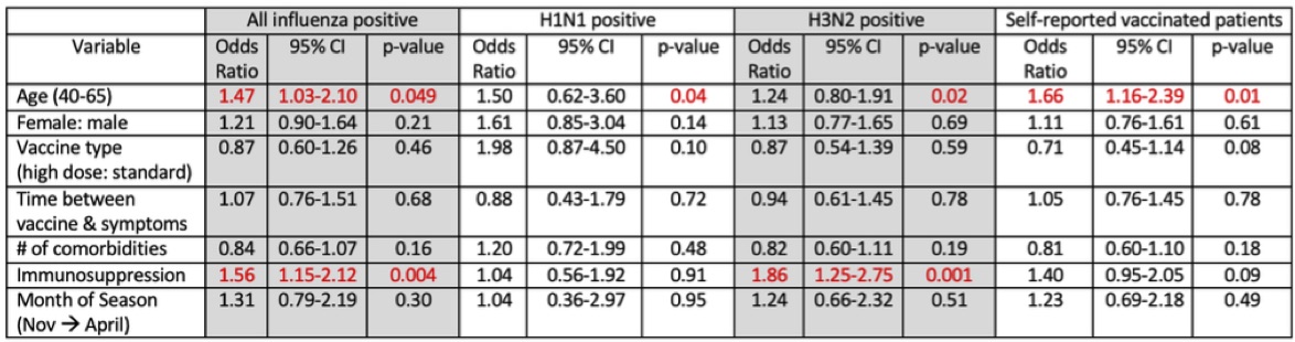 Table 2: Logistic regression analyses of vaccinated, hospitalized influenza positive patients; vaccinated, hospitalized patients with influenza A subtypes and self-reported vaccinated, hospitalized influenza positive patients.
