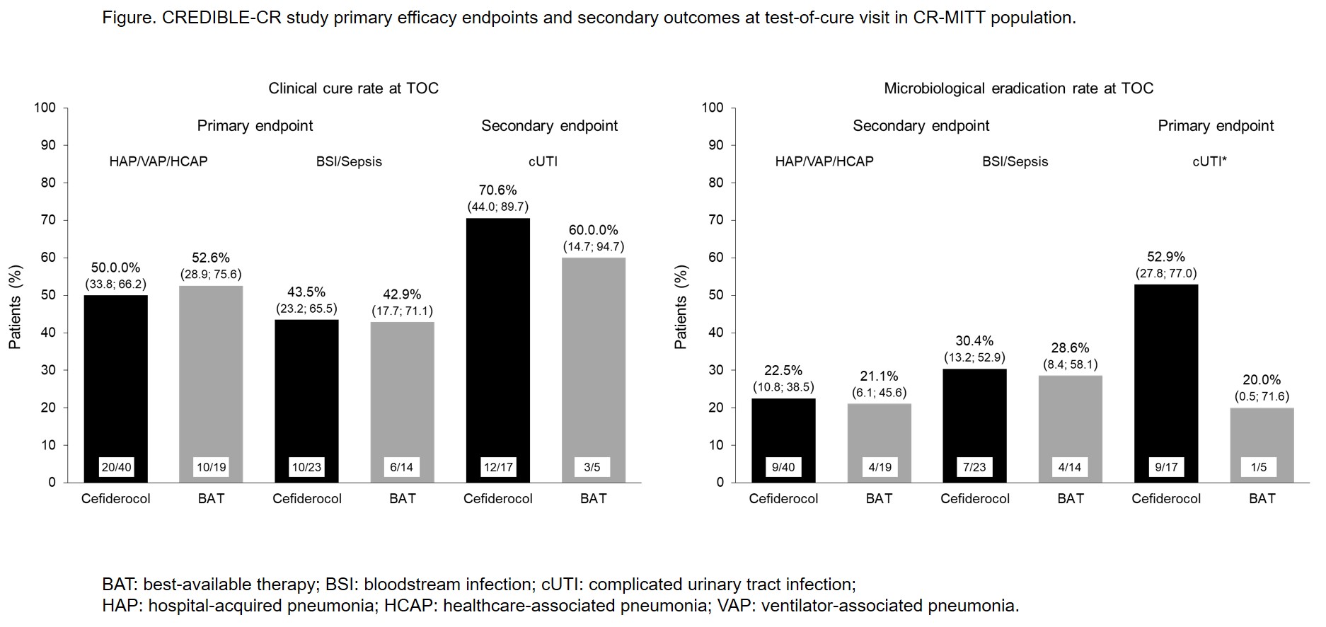 Figure. CREDIBLE-CR study primary efficacy endpoints and secondary outcomes at test-of-cure visit in CR-MITT population.