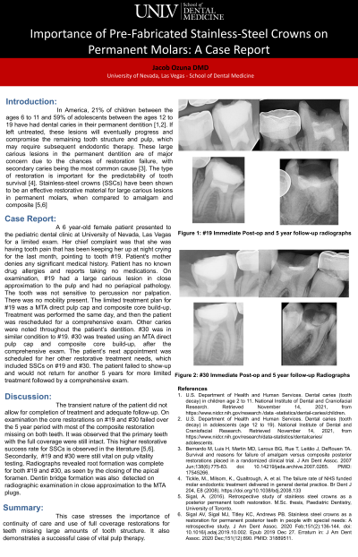 Large carious lesions on permanent molars, which may require subsequent endodontic therapy, are observed in children and adults. The integrity of a final restoration, after the completion of the endodontic therapy, is crucial for the survival of a tooth. Evidence shows full coverage restorations are an effective means of increasing longevity of the restoration and reducing the risk of fracture. This case report presentation follows a pediatric patient which underwent endodontic therapy of multiple teeth, did not return to have the full coverage restorations placed, and revisited the clinic 5 years later. This case will demonstrate the importance of continuity of care and use of pre-fabricated stainless-steel crowns on permanent molars.