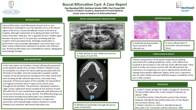 A buccal bifurcation cyst/inflammatory buccal cyst is a rare inflammatory odontogenic cyst that typically occurs at the buccal region of the first or second mandibular molars at the time of eruption, although involvement of erupting premolars and third molars have been observed. This is typically found in children aged between 6-8 years and 11-12 years old, correlating with the eruption of the associated molar. Histologic examination is performed to rule out benign odontogenic cysts and tumors, and often reveals inflammatory epithelium consistent with an inflamed cyst, the buccal bifurcation cyst is identified by clinical, radiographic and histologic findings.