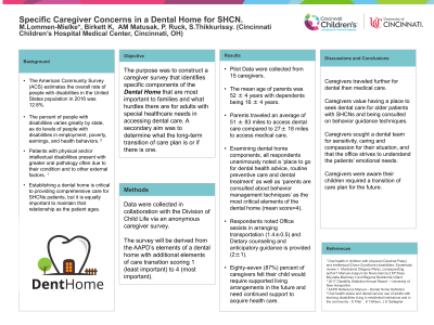 Purpose: The purpose is to construct and validate a caregiver survey that identifies components of the Dental Home most important to families and hurdles for adults with SHCNs in accessing dental care.