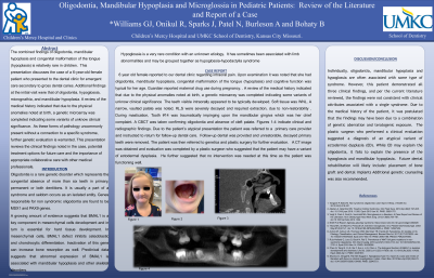 Introduction: The combined findings of oligodontia, mandibular hypoplasia and congenital malformation of the tongue (hypoplasia) is relatively rare in children. This presentation discusses the case of a 6-year-old female patient who presented to the dental clinic at The Children’s Mercy Hospital in Kansas City, Missouri for emergent care secondary to gross dental caries. Additional findings at the initial visit were that of oligodontia, microglossia, micrognathia, and mandibular hypoplasia. A review of the medical history indicated that due to the physical anomalies noted at birth, a genetic microarray was completed indicating some variants of unknow clinical significance. As these forms of pathology uncommonly present without a connection to a specific syndrome, further genetic evaluation is warranted. This presentation reviews the clinical findings noted in the case, potential treatment options for future care and the importance of appropriate collaborative care with other medical professionals.