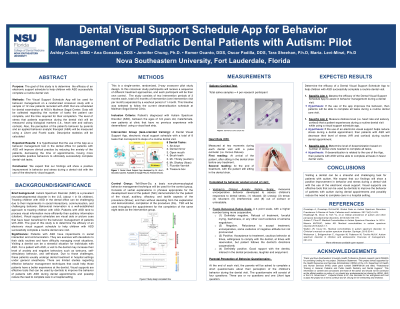 Methods: The Visual Support Schedule App will be used for behavior management on a randomized crossover study with a sample of 12 new patients recruited with ASD that are scheduled for dental examination at NSU’s Mailman Segal Center. Data will be collected regarding the number of tasks the patient can complete, and the time required for their completion. The level of stress that patients experience during the dental visit will be measured using biological markers (i.e., heart rate and salivary cortisol). Also, the perception of the patient’s behavior by parents and an applied behavior analytic therapist (ABA) will be measured using a Likert and Frankl scale. Descriptive statistics will be calculated for all study variables.