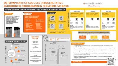 Methods: A comprehensive literature search for articles between the years 2000-2020 was carried out in Pubmed using the keywords pulp revascularization, regenerative endodontics, pulp revitalization, stem cells, immature teeth, root development, child. The search was limited to case reports, case series, and clinical trials. The search was conducted by a reference librarian. The search yielded a total of 225 articles. Inclusion criteria as follows were applied to the search results: a) pediatric patients under 16 years of age b) 6 months or greater follow up c) application of REP technique to the permanent tooth. Data from included cases and case series was extracted by three researchers into a spreadsheet. Extracted data was broadly categorized as a) patient parameters b) tooth parameters and c) outcomes. Patient and tooth parameters were correlated with outcomes of REP to assess which are statistical predictors of favorable outcomes.