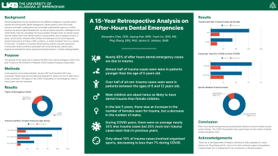 Purpose: The purpose of this study was to analyze the after-hours dental emergency visits in the past 15 years at the Children’s of Alabama (COA) Hospital Emergency Department.
