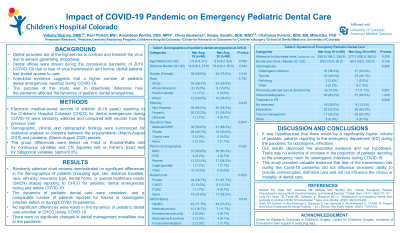 Methods: Electronic medical-dental records of children (0-18 years) reporting to the Children’s Hospital Colorado for pediatric dental emergencies between December 2018-December 2020 were randomly selected. The number, type, and factors associated with emergency visits during were assessed for all emergencies reporting during pandemic and a comparable pre-pandemic period from prior year. Demographic information was reported in percentages or mean±SD. Group differences were tested via t-test or Kruskal-Wallis test for continuous variables and Chi Squared test or Fisher’s Exact tests for categorical variables. Alpha value was set at 0.05.