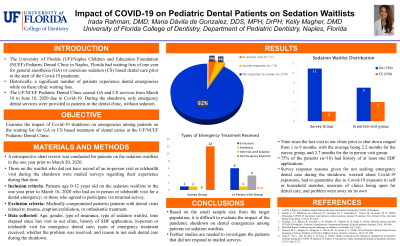Purpose: Dental caries remains a prevalent disease in children. The University of Florida, Naples (UFCD) pediatric dental clinic has waiting lists of one year for children who require dental care under general anesthesia (GA) or conscious sedation (CS). A significant number experience dental emergencies while on waitlists. From March 16 to June 16, 2020, the UFCD pediatric dental clinic shutdown GA and CS services due to the Covid-19 pandemic. The purpose of this study was to examine the impact of sedation shutdown (SS) on emergencies among patients on waitlists for GA or CS.