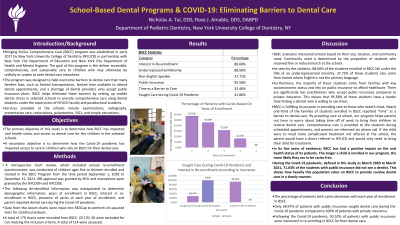 Purpose: The purpose of this study is to evaluate access to dental care and oral health status for NYC elementary school children (ages 5-12) treated in two school-based dental programs overseen by New York University College of Dentistry (NYUCD) Bringing Smiles Comprehensive Care (BSCC). Variables assessed include re-enrollment in the dental program, barriers to dental care, pending dental treatment, referral, and the impact of the COVID-19 pandemic.