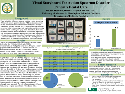 Conclusion: ASD patients can benefit from a visual schedule successfully complete more steps in a dental cleaning, progress at a quicker rate, and exhibit lower behavioral stress.