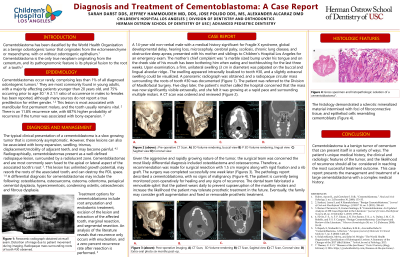 This case report describes the multidisciplinary approach to treatment of a lesion in the mandible of a medically complex patient at Children’s Hospital Los Angeles. A 15-year-old male with significant developmental/cognitive delay, cerebral palsy, scoliosis, and asthma presented for his dental recall exam with a hard swelling, approximately 4 cm in diameter. The swelling could be palpated on the right mandible, buccal and lingual to tooth #30. The oral surgery department was consulted, and the patient underwent resection of a significant portion of the right mandible including teeth #28-32. The pathology report determined the lesion was a cementoblastoma. The patient required an additional surgery to extract a periodontally compromised tooth #24, restore caries, and take upper and lower impressions. A removable splint was fabricated to prevent supraeruption of the maxillary teeth, as his developmental delay prohibits him from tolerating a traditional removable prosthesis at this time.