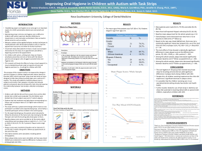 Purpose: The purpose of this continuation study is to measure the change in amount of plaque in children with Autism Spectrum Disorder (ASD) who have been using visual task strips at home designed to help them follow brushing steps over a period of three months. Task strips are utilized by behavior analysts to help individuals follow a routine when completing daily activities and its implementation in pediatric dentistry can allow for children to follow a more consistent and improved oral hygiene regimen. This study is designed to verify results of previous pilot study and achieve more robust results.