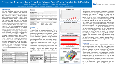 Methods: This research was approved by University at Buffalo Institutional Review Board. A total of 500 patients between the ages of 3 and 17 will be recruited. Pediatric Sedation Behavior Scoring was assessed by the sedation resident/nurse and the operating dentist, with raters blinded to one another’s assessment. Data was gathered for all types of sedation over a wide scope of dental procedures. Demographics, procedural details and scores were collected, and comparative data analysis will be used.