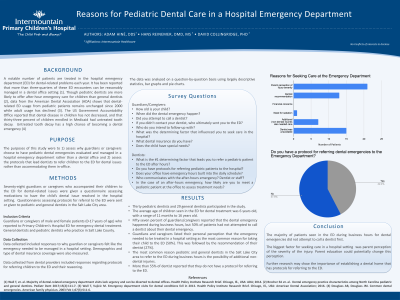 Methods: Seventy-eight caregivers who accompanied their children to the ED for dental-related issues were given a questionnaire assessing motivations to have the child’s dental issue resolved in the ED. Similar questionnaires were emailed or given to pediatric and general dentists in the Salt Lake area.