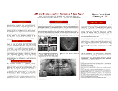 Tsuchiyama, A.,White, J., Yoong, P</span> Herman Ostrow School of Dentistry of USC, Los Angeles, CA Abstract: Case Report of LSTR and Dentigerous Cyst Formation Lesion sterilization and tissue repair (LSTR) is a non-vital pulp therapy technique involving an antibiotic paste without mechanical instrumentation. This case report discusses a 5-year-10-month-old female patient who was referred to the USC Pediatric Dental Clinic for comprehensive dental treatment. Several caries were present (notably with an abscess on #T), with subsequent LSTR treatment of #S and #T utilizing a triple antibiotic paste of metronidazole, ciprofloxacin and minocycline. Three years following LSTR treatment a asymptomatic unilocular, well-defined radiolucent lesion was identified between the root of #29 and #30. An oral surgery excisional biopsy was performed, in which the lesion was removed and histologically identified as a dentigerous cyst. This report discusses the potential adverse outcome of a dentigerous cyst developing post-LSTR treatment.