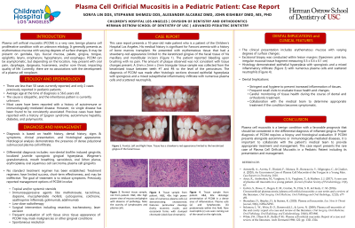 Plasma cell orificial mucositis (PCOM) is a very rare, benign plasma cell proliferative condition with an unknown etiology. It is generally reported in adults and elderly patients, and it is typically characterized by erythematous mucosa with varying degrees of surface changes. The purpose of this case report is to present clinical findings for an 11-year-old male patient recently diagnosed with PCOM after biopsy. The patient reported bleeding upon brushing with no pain. He presented with erythematous tissue that had a strawberry-red appearance limited to the keratinized gingiva of the facial tissue. The patient’s medical history is also significant for Fanconi anemia with a history of bone marrow transplant. Less than 50 cases have previously been reported in the literature, and only two other cases have been reported in pediatric patients. This report represents the third known case to be reported for a pediatric patient.