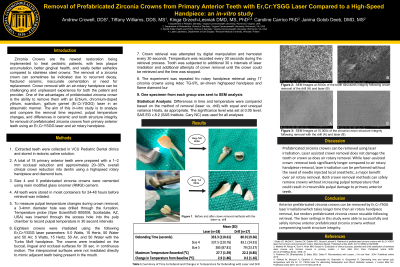 Conclusions: Er,Cr:YSGG laser and rotary handpiece can both be used predictably to remove zirconia crowns from primary anterior teeth. While a rotary handpiece presents a more efficient method of removal, Er,Cr:YSGG laser offers a viable alternative method.