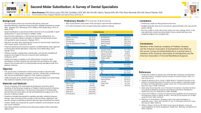 Methods: A survey was designed consisting of 20 total questions including: demographics regarding specialty and location of residency program, education and type of training on the concept of second molar substitution, and specific scenarios regarding treatment planning hypomineralized first molars. Content validity was assessed by a panel of pediatric and endodontic faculty and current residents. The survey will be distributed via email to active members of the American Academy of Pediatric Dentistry, the American Association of Endodontists, the American Association of Orthodontics, and the American Association of Oral and Maxillofacial surgeons. Descriptive statistics, bivariate and multivariate analysis will be calculated (alpha=0.05).