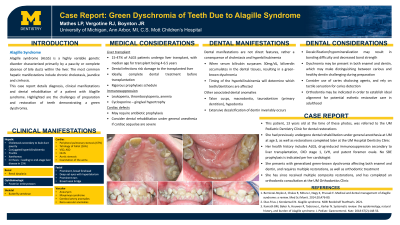 Alagille syndrome is a highly variable genetic disorder characterized primarily by a paucity or complete absence of bile ducts within the liver, most commonly hepatic manifestations include chronic cholestasis, jaundice and cirrhosis. It is also associated with congenital heart defects, which can include Tetralogy of Fallot, Coarctation of the aorta and septal defects. A common manifestation of hepatic complications is green discoloration of teeth. This case report details diagnosis, clinical manifestations and dental rehabilitation of a patient with Alagille syndrome. Highlighted is the challenges of preparation and restoration of teeth demonstrating a green dyschromia. Included in this report is a review of the common systemic manifestations of Alagille syndrome.