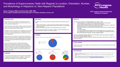 Purpose: The purpose of this retrospective chart review was to contribute to the current research focused on supernumerary teeth in Hispanic vs. Non-Hispanic patients, primarily emphasizing location, orientation, number and morphology of the supernumerary teeth.