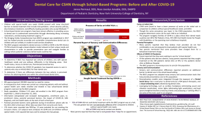 Methods: A retrospective chart review was carried out to compare patients with and without special health care needs enrolled and treated in two school-based dental programs overseen by New York University College of Dentistry's Bringing Smiles Comprehensive Care (BSCC) program. The study population consisted of children 5-13 years old who enrolled in the BSCC program from September 1, 2018 to December 31, 2021. The following de-identified information was extrapolated and reviewed: demographics, enrollment years, re-enrollment status, parental perceived barriers, the impact of COVID-19, SHN diagnoses, and oral health status at the start of each school year.