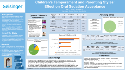 Methods: Prospective data was collected amongst preschool-aged and school-aged children that are patients of record, classified as American Society of Anesthesiology (ASA) Classification I or II, that completed dental treatment under oral sedation at Geisinger Pediatric Dentistry. Data collected included patient’s temperament, specifically extraversion/surgency, negative affectivity, and effortful control, as well as parents’ reactions to child behavior.