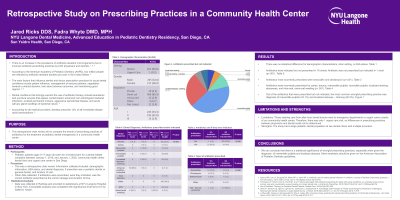 Methods – A retrospective chart review was conducted on 515 subjects 0-17 years old seen for dental-related emergency visits (procedure code corresponding with a limited exam or a problem focused concern) between January 1, 2019-January 1, 2020. Information collected included demographics, dental diagnosis, indication for antibiotics and/or opioids, and provider type. The entry was categorized for prescribing adherence (Yes/No) based on pooled literature and guidelines.