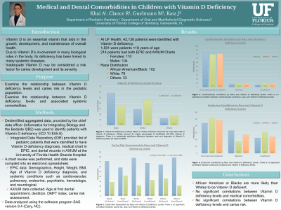 Methods: Deidentified aggregate data, provided by the chief data officer (Informatics for Integrating Biology and the Bedside I2B2) was used to identify patients with Vitamin D deficiency (ICD 10 E55.9). Medical and dental records were assessed and the following information collected and transferred to an electronic spreadsheet: age the time of diagnosis, gender, race, ethnicity, insurance, height, weight, BMI, Vitamin D levels, systemic conditions, DMFT index, caries risk assessment, caries diagnosis, sedation and general anesthesia experience, and emergency treatment history.