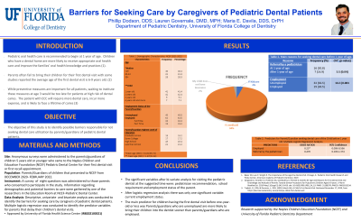 Methods: Anonymous surveys were administered to the parents/guardians of children 5 years old or younger who came to the NCEF pediatric dental clinic for their first dental visit or first recall appointment. Information was collected about reasons for completing their first dental visit on time, delaying their children’s dental visits, and demographics. IRB approved the survey instrument and data analysis was completed using…